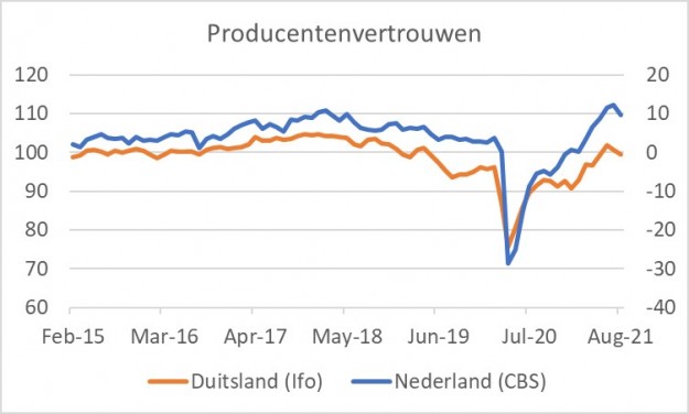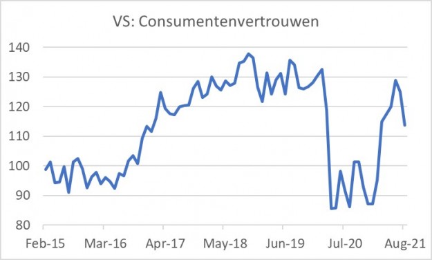 Hetzelfde geldt voor het consumentenvertrouwen in de VS. Volgens de maatstaf van de Conference Board daalde het consumentenvertrouwen in de VS van 125,1 in juli tot 113,8 in augustus. Dat is best een forse daling, die vooral wordt verklaard uit de opkomst van de deltavariant. Volgens het persbericht speelden ook zorgen over de hoge energie-, benzine- en voedselprijzen een rol.