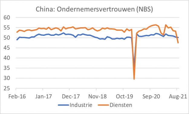 Het volgende plaatje laat de indices zien van het Chinese ondernemersvertrouwen volgens de officiële statistieken. Hier valt op dat het vertrouwen van ondernemers vooral in de dienstensector in augustus een klap heeft gekregen. Toenemende aantallen besmettingen en lockdownmaatregelen vormen hier de verklaring. Deze index is weer tot onder 50 gedaald en het plaatje laat mooi zien dat dit veel lager is dan voor de pandemie gebruikelijk was. Ook het vertrouwen van ondernemers in de industrie daalde iets in augustus.