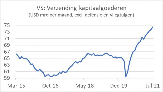 Ook andere ontwikkelingen bij bedrijven zijn positief. Het volgende plaatje geeft een indicatie van het investeringsgedrag van Amerikaanse bedrijven. De maandreeks van de verzending van kapitaalgoederen wordt als een 'proxy' gebruikt voor de bedrijfsinvesteringen in de nationale rekeningen. Tot dusver groeien de bedrijfsinvesteringen fors door.