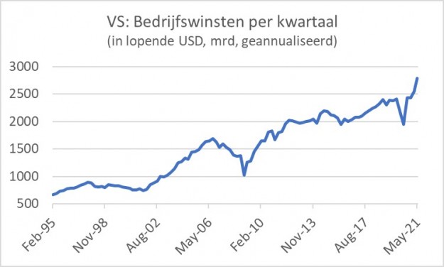 Het volgende plaatje laat de ontwikkeling van de bedrijfswinsten zien zoals die in de nationale rekening wordt weergegeven. Het gaat hier dus om alle bedrijven, niet alleen om beursgenoteerde. Het totaal bedrag aan bedrijfswinsten steeg in het tweede kwartaal met 9,2% ten opzichte van het eerste kwartaal, toen ook al sprake was van een stijging met 5,1%. Vergeleken met het tweede kwartaal vorig jaar stegen de winsten met meer dan 43%, maar dat zegt niet veel vanwege de diepe recessie vorig jaar. Ten opzichte van het gemiddelde winstniveau in 2019 lagen de winsten in het tweede kwartaal bijna 18% hoger.