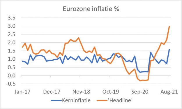 De inflatie in de eurozone is in augustus opgelopen tot 3%, van 2,2% in juli, zoals het laatste plaatje laat zien. De kerninflatie bedroeg 1,6%, na 0,7% in juli. Dat klinkt alarmerender dan het feitelijk is. Basiseffecten speelden hier een belangrijke rol. Dat wil zeggen: in augustus vorig jaar daalden de prijzen ten opzichte van juli en ze stegen juist dit jaar. Maar die maand op maand stijgingen waren allerminst exorbitant: +0,4% voor de 'headline' inflatie en +0,3% voor kerninflatie. Anderzijds is een maandelijkse stijging van 0,4% natuurlijk ook weer niet heel laag en de inflatievooruitzichten blijven vooralsnog onzekerder dan voor de pandemie het geval was.