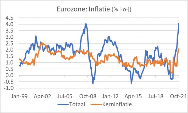 In oktober overtrof de inflatie de verwachtingen opnieuw in vrij ruime mate. Maand-op-maand stegen de prijzen in de eurozone met maar liefst 0,8%. De jaar-op-jaar inflatie liep op tot 4,1% van 3,4% in september. De kerninflatie (dat wil zeggen exclusief voedsel, energie, alcohol en tabak) bedroeg 0,3% maand-op-maand en 2,1% jaar-op-jaar. Sinds de invoering van de euro in 1999 heeft de inflatie gemiddeld 1,6% bedragen en de kerninflatie 1,3%.