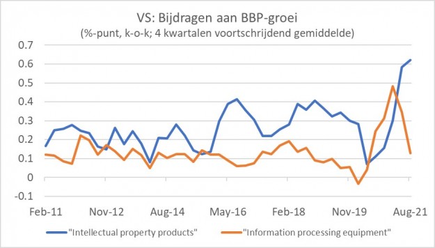 In mijn optiek zijn de cijfers over de investeringen van bedrijven (exclusief die in voorraden) de meest interessante van het geheel. De eerste grafiek laat de groeibijdrage zien van investeringen in information processing equipment en in intellectual property products. Toen de pandemie toesloeg en de economie in een ongekend abrupte recessie duwde, kwamen verdienmodellen massaal onder druk. Bedrijven reageerden met een sprong vooruit. Er werd fors geïnvesteerd in digitalisering. Dat is terug te zien in de stijging van de groeibijdrage van information processing equipment vanaf het tweede kwartaal. Met een kleine vertraging is vanaf het derde kwartaal ook de groeibijdrage van investeringen in intellectual property products fors toegenomen. Dat stemt mij positief over de in de toekomst te verwachten ontwikkeling van de productiviteit en de winstgevendheid van bedrijven.