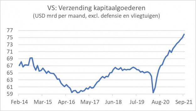 Met de bedrijfsinvesteringen als geheel gaat het ondertussen goed in de VS. Het is al langer een thema dat ik op de voet volg. Het volgende plaatje laat de waarde zien van de kapitaalgoederen die in de VS verzonden worden. In september steeg het bedrag naar $75,9 miljard, van $74,9 in augustus. Het niveau lag 2,7% hoger dan een jaar eerder (augustus 11,6%). Deze reeks is een proxy voor de bedrijfsinvesteringen. Wel dient bedacht te worden dat het nominale bedragen betreft en dat ook kapitaalgoederen duurder kunnen worden in deze tijd van tekorten aan materialen etc. Toch suggereert dit plaatje heel sterk dat bedrijven de schok van de pandemie, inclusief de leveringsproblemen en personeelsproblemen hebben aangegrepen om meer te investeren. Dat moet positief zijn voor de productiviteit en de winstgevendheid.