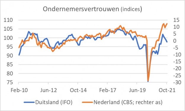 Het ondernemersvertrouwen in respectievelijk Duitsland en Nederland divergeert. In Duitsland daalde de toonaangevende IFO-index in oktober voor de vierde maand op rij en kwam onder het langjarig gemiddelde uit. De index zoals het CBS die samenstelt over het producentenvertrouwen onder industriële ondernemers in ons land evenaarde juist de hoogste stand ooit in oktober en is in de afgelopen maanden alleen in augustus even verzwakt. Het volgende plaatje biedt een interessant beeld. Tot aan 2018 lopen beide indices mooi met elkaar in de pas. Maar in de loop van 2018 verzwakt het Duitse ondernemersvertrouwen veel meer dan dat bij ons. Dat ligt dan ongetwijfeld aan de Dieselgate problemen in de voor Duitsland zo belangrijke automobielindustrie. Ook het recente divergeren van beide reeksen heeft waarschijnlijk vooral te maken met problemen in de automobielindustrie nu die getroffen wordt door ernstige en aanhoudende tekorten van chips. Een andere verklaring zou zijn dat Nederlandse ondernemers slimmer zijn dan de Duitse en zodoende beter inspelen op de verstoringen van supply chains. Ik zou dat niet helemaal uitsluiten. Het improvisatievermogen is in Nederland in het algemeen toch wat hoger dan in Duitsland. Ik zeg dit op basis van eigen ervaringen uit de tijd dat ik in Duitsland woonde. Maar het belangrijkste is ongetwijfeld de problematiek van de autoindustrie.