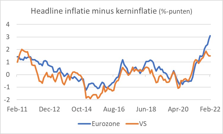 In Europa is de inflatie ook opgelopen. Toch denk ik dat het probleem in de VS veel groter is dan bij ons. Tijdens de persconferentie van de ECB herhaalde mevrouw Lagarde dat de inflatie in de eurozone voor meer dan de helft wordt veroorzaakt door energieprijzen. In de VS is het inflatieproces veel breder. Het volgende plaatje laat het verschil zien tussen de totale inflatie, ook wel 'headline', en de kerninflatie (dat is voor de VS exclusief voedsel en energie en voor de eurozone exclusief voedsel, energie, alcohol en tabak) zien. Graag vestig ik de aandacht op de meest recente ontwikkeling. Het verschil tussen beide inflatiemaatstaven is in de eurozone veel groter dan in de VS. Dat bevestigt dat de inflatie in de VS een breder karakter heeft dan die in de eurozone.
