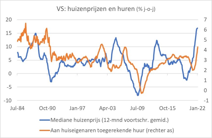 Een enorm probleem voor de VS wordt gevormd door de huizenmarkt. Huizenprijzen zijn fors gestegen. Huren volgen in de VS de huizenprijzen, zij het met enige vertraging. Huren van werkelijk verhuurde woningen hebben in de Amerikaanse inflatiemand een gewicht van 7,4%. Aan huiseigenaren toegerekende huren hebben zelfs een gewicht van 24,2%. De stijgende huizenprijzen tikken zodoende met enige vertraging stevig door in het inflatiecijfer. Ik heb hier al regelmatig over geschreven. De volgende grafiek laat zien dat die toegerekende huren inmiddels 4,3% hoger zijn dan een jaar geleden. Cijfers van Zillow (zeg maar de Amerikaanse Funda) over huren suggereren dat de stijging eerder versnelt dan afzwakt. Wanneer de energieprijzen niet meer stijgen, kan hierdoor het totale inflatiecijfer nooit snel richting de 2% gaan. Ik vermoed dat de Amerikaanse inflatie lange tijd boven 4% zal blijven.