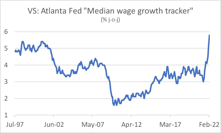 In tegenstelling tot in Europa is de loonstijging in de VS inmiddels ook al stevig aangetrokken. Een interessante indicator daarvoor wordt samengesteld door de Federal Reserve van Atlanta, de 'median wage growth tracker'. Zoals het volgende plaatje laat zien is de mediane loonstijging inmiddels versneld tot 5,8%, de grootste stijging ooit, dat wil zeggen in de 25 jaar dat deze cijfers worden bijgehouden. Als je ervan uitgaat dat de productiviteit in de VS trendmatig stijgt met 1%-1,5%, dan is het, gegeven deze loonstijging ook al moeilijk in te zien hoe de inflatie binnen afzienbare tijd onder 4% zou kunnen dalen.