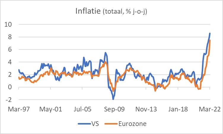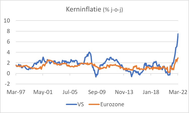 Het aanzienlijke verschil tussen de kerninflatie in beide economieën duidt erop dat het inflatieproces zich verder door de Amerikaanse economie heeft verspreid dan door de Europese. Daardoor kan de ECB een iets afwachtender houding aannemen dan bijvoorbeeld de Fed. Maar ja, je kunt ook zeggen: kijk naar de lichte paniek bij de Fed en dat zou je toch voor willen zijn, dus doe nu iets. We weten dat het even duurt voordat monetair beleid volledig effectief is. Je moet met monetair beleid niet wachten tot het te laat is. Centrale bankiers worden ervoor betaald om een inschatting te maken van toekomstige ontwikkelingen en daarop nu beleid uit te stippelen.