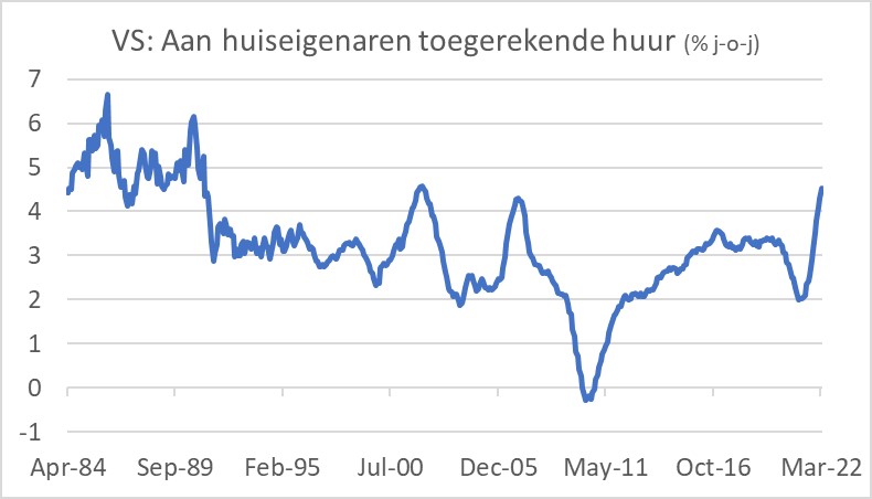 Overigens wil ik herhalen wat ik al diverse keren heb geschreven. Het is een illusie te denken dat de Amerikaanse inflatie binnen afzienbare tijd naar 2% zakt. Het kan best dat de inflatie in de VS nu dichtbij of zelfs op het hoogtepunt is, maar de gewenste 2% ligt behoorlijk ver in de toekomst. De reden daarvoor ligt op de huizenmarkt. De huizenprijzen zijn in de VS de laatste tijd, net als bij ons fors gestegen. De huurmarkt werkt in de VS heel anders dan bij ons. Wij hebben een grote sociale sector en de overheid heeft de huurstijging aan banden gelegd. De spanning op de huurmarkt manifesteert zich dan in tekorten in plaats van huurstijgingen. Maar in de VS volgen de huren de huizenprijzen, zij het met vertraging. Werkelijk betaalde huren en aan huiseigenaren toegerekende huren hebben in het Amerikaanse inflatiemandje een gewicht van ruim 31% (bij ons ruim 22%). Zoals de volgende grafiek laat zien, bedraagt de stijging van aan huiseigenaren toegerekende huren in de VS inmiddels 4,5% (bij ons 0,7%). De werkelijke huren lagen in maart 4,4% hoger dan een jaar geleden. Ik denk dat de stijging van de huren in de VS voorlopig nog verder zal oplopen. Uiteraard gaat de rentestijging de huizenprijzen dempen en daarmee na enige tijd ook de huurstijging, maar dat heeft tijd nodig.