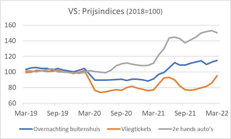 Het volgende plaatje nodigt uit tot een kort betoog over de dynamiek in het huidige inflatieproces in de VS. Het plaatje laat de prijsontwikkeling zien van drie totaal verschillende bestedingscategorieën. In 2019 – en ook daarvoor trouwens – was het beeld behoorlijk stabiel. Er was lage inflatie en de prijzen van deze bestedingscategorieën liepen niet ver uit de pas. Dan breekt de coronatijd aan en wordt de relatieve rust ruw verstoord. Reizen wordt beperkt en de lagere vraag naar vliegreizen en overnachtingen in hotels, motels en B&B's drukt de prijzen daarvan naar beneden. De vraag naar auto's neemt juist toe, want mensen hebben opeens meer geld aan goederen te besteden doordat ze minder aan diensten kunnen besteden. Misschien willen ze ook liever geen gebruik maken van het openbaar vervoer. Autoproducenten hebben problemen met hun productie vanwege chiptekorten. Het gevolg is een forse stijging van de prijs van gebruikte auto's. Het kan niet anders dan dat de inflatie van gebruikte auto's een keer zal temperen en uiteindelijk zullen de prijzen mogelijk zelfs weer gaan dalen, maar voorlopig is dat nog niet aan de orde.
