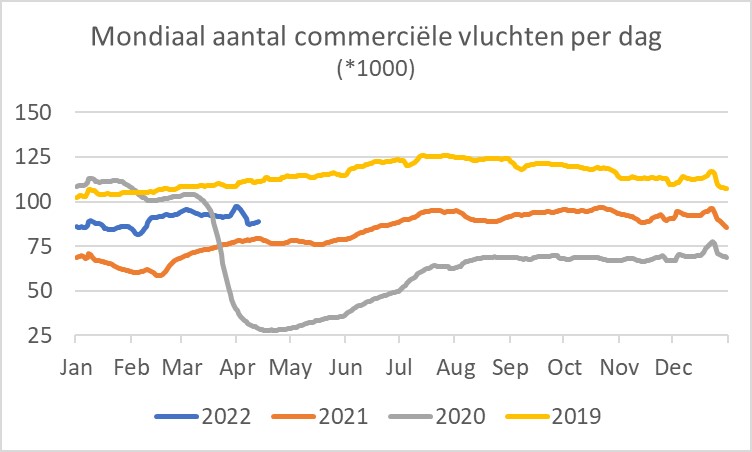 Dat vliegen nog altijd iets goedkoper is (volgens de Amerikaanse prijsstatistieken) dan voor de pandemie is consistent met het niveau van het vliegverkeer. Het volgende plaatje laat zien dat het aantal vluchten dat per dag plaatsvindt momenteel weliswaar duidelijk hoger ligt dan in 2020 en 2021, maar dat het nog altijd achterblijft bij de aantallen van 2019.