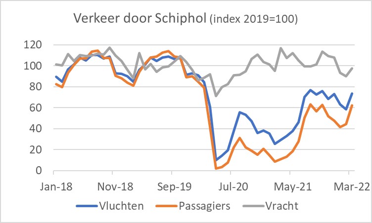 In de loop van vorig jaar werd het leven wat vrijer en nam de vraag naar overnachtingen weer toe. De prijzen daarvoor herstelden zich en de grafiek maakt duidelijk dat de prijzen verder zijn blijven stijgen en inmiddels ruim boven het niveau van voor de pandemie liggen. Het vliegverkeer is nog niet terug op het niveau van voor de pandemie. Toch is de prijs van vliegtickets inmiddels aan een stevige opmars bezig. In maart alleen al steeg de prijs van vliegtickets met 9,7% ten opzichte van februari en met ruim 23% ten opzichte van maart 2021, maar vliegen is nu toch nog iets goedkoper dan voor de pandemie