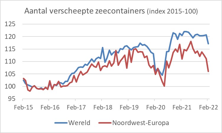 De wereldhandel heeft zich indrukwekkend hersteld van de coronarecessie. Maar in februari is het aantal verscheepte zeecontainers opmerkelijk fors gedaald. Of dat is veroorzaakt door Chinees Nieuwjaar, door Chinese lockdowns of door de oorlog in Europa en de daaraan gerelateerde sancties, is niet duidelijk. De cijfers over maart kunnen daarop meer licht laten schijnen.