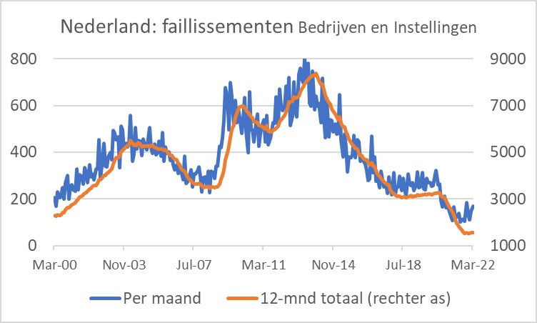 De Kamer van Koophandel kwam eerder met een bericht dat een groot aantal bedrijven op omvallen staat. Een aantal van 200.000 dook zelfs op in een krantenkop. Het laatste plaatje van deze week laat het aantal faillissementen van 'bedrijven en instellingen' zien. Voor de pandemie was het aantal faillissementen al opmerkelijk laag en tijdens de pandemie is dat aantal tegen de aanvankelijke verwachting in verder gedaald. Datzelfde zien we in andere landen, maar misschien niet zo duidelijk als bij ons. Inmiddels daalt het aantal faillissementen niet meer. Een lichte stijging tekent zich af nu de steunmaatregelen van de overheid zijn gestopt. Daar komen de oorlog, de sancties en de gestegen grondstofprijzen nog eens bovenop. Het zit er dik in dat het aantal faillissementen de komende tijd behoorlijk verder zal oplopen. Dat is heel vervelend voor de betrokkenen, maar het geeft de markteconomie dynamiek. Hopelijk kunnen de betrokkenen snel een nieuwe start maken.