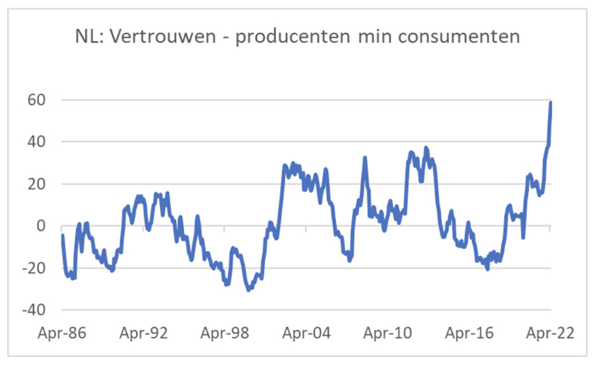 Er is iets heel ongebruikelijks gaande in de Nederlandse economie. Het consumentenvertrouwen is volgens de maatstaf van het CBS, die tot 1986 teruggaat, nooit lager geweest dan in april van dit jaar. Tegelijkertijd is het vertrouwen onder ondernemers in de industrie juist heel sterk. Het niveau van die CBS-reeks was in april het op zes na hoogste maandcijfer sinds het begin van deze reeks in 1985. Het verschil tussen beide reeksen bereikte dan ook een record, by a wide margin. Nu mag je de waarden van zulke reeksen niet zomaar van elkaar aftrekken, zoals ik in het onderstaande plaatje wel heb gedaan. De reeks van het consumentenvertrouwen is veel beweeglijker dan die van het producentenvertrouwen. Maar ook als je daar rekening mee houdt, dan is het verschil tussen het pessimisme van consumenten in april en het optimisme van producenten deze maand ongeëvenaard.