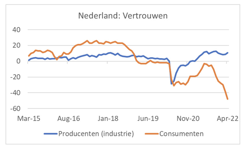 Het zijn economisch heel onzekere tijden en er gebeuren wonderlijke dingen in de economie. Voor nerdy-achtige economen zoals ik, is het allemaal fascinerend. Nooit eerder was het verschil tussen het pessimisme onder consumenten in ons land en het optimisme van industriële ondernemers zo groot als in april. Ik denk dat dat komt doordat consumenten depri raken van de hoge inflatie, terwijl ondernemers de kostenstijgingen kennelijk kunnen doorberekenen. Nederlandse consumenten besteden ondanks hun pessimisme stevig. Is dit 'retail therapy'? Die groei van de bestedingen kan niet aanblijven houden. Daarvoor is de inflatie te hoog en de inkomensgroei te beperkt. Tegelijkertijd biedt de consument de producenten op deze manier wel uitgelezen kansen om de prijzen te verhogen. Volgens de laatste cijfers is de inflatie bij ons iets gedaald in april. Maar dat algehele cijfer verhuld dat de daling vooral te danken is aan de verlaging van brandstoffen-accijnzen. Onderliggend verbreedt de inflatie zich juist in Nederland evenals in de eurozone als geheel. Daar zijn we voorlopig nog niet van af.
