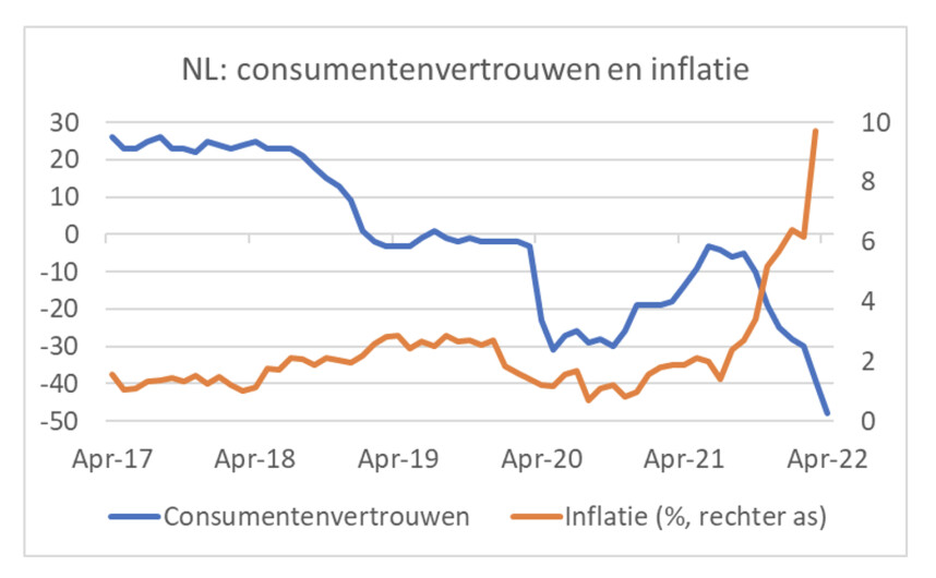 Het volgende plaatje laat zien dat het consumentenvertrouwen vooral onder druk is gekomen vanaf het moment dat de inflatie versnelde. Dat gebeurde in de tweede helft van vorig jaar.