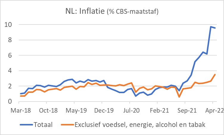De inflatie blijft voorlopig de gemoederen nog wel even bezighouden. In ons land publiceerde het CBS de eigen inflatiecijfers voor april. De inflatie bedroeg 9,6%, iets lager dan de 9,7% in maart. Het inflatiecijfer werd wat gedrukt door de accijnsverlaging op benzine en diesel per 1 april. Helaas begint de inflatie zich ook in ons land nu te verbreden.