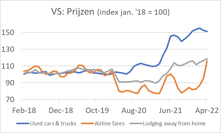 De Amerikaanse inflatie is in april eveneens iets teruggevallen: van 8,5% in maart tot 8,3% in april. De kerninflatie is in de VS aanmerkelijk hoger dan bij ons, al viel die in april wel iets terug ten opzichte van maart: 6,2% tegen 6,5%. De details van het Amerikaanse inflatierapport laten mooi zien wat er in de economie gebeurt. Het volgende plaatje laat de prijsontwikkeling zien van gebruikte auto's, vliegtickets en de kosten van overnachtingen in hotel en B&B's. De fenomenale prijsstijging van gebruikte auto's lijkt voorbij. Vliegtickets worden daarentegen heel snel duurder nu men weer wil vliegen. Hotel en B&B's waren in de pandemie goedkoper geworden, maar dat is compleet veranderd. Sinds het dieptepunt in februari 2021 zijn de prijzen met ruim 32% gestegen.