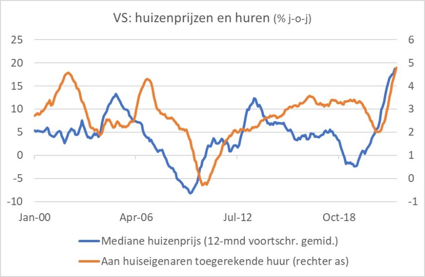 Bij de Fed is inmiddels lichte paniek uitgebroken en ze lijken vastberaden om de inflatie onder controle te brengen door de officiële rente snel te verhogen. Een prima plan, lijkt me. Volgens mij zal de inflatie desondanks niet snel in de buurt van de doelstelling van 2% komen. Niet alleen is het gat nog groot, ook de huizenmarkt staat een snelle teruggang richting 2% in de weg. Huren en aan huiseigenaren toegerekend huren maken meer dan 30% van de Amerikaanse inflatiemand uit. Beide vormen van huur volgen de huizenprijzen met een behoorlijke vertraging. Het volgende plaatje laat zien dat de stijging van de huren de komende tijd nog wel eens verder kan versnellen dan de 4,8% in april.