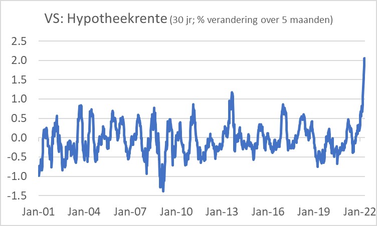 Overigens geeft de Amerikaanse huizenmarkt nog geen krimp ondanks de forse stijging van de hypotheekrente in de laatste maanden. Het volgende plaatje laat de verandering zien van de dertig jaar rentevaste hypotheektarieven over een periode van vijf maanden. Zo sterk de tarieven de laatste maanden zijn opgelopen, is ongekend gedurende de laatste twintig jaar. In het verleden is gebleken dat de Amerikaanse huizenmarkt zeer rentegevoelig is. Het kan daarom mijns inziens niet lang meer duren voordat die markt een klap krijgt.