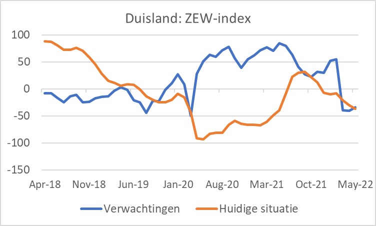 De vooruitzichten voor de economische groei blijven heel onzeker. De ZEW-index voor Duitsland die het vertrouwen meet dat economen en analisten in de nabije economische toekomst van dat land hebben, is in mei iets verbeterd, maar blijft op een laag niveau. De taxatie van de huidige stand van zaken zette daarentegen de daling van de afgelopen maanden voort.
