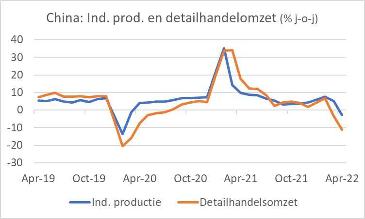 In China is het virus nog niet bedwongen volgens de autoriteiten en gelden nog altijd stevige beperkingen in het openbare leven, al worden die inmiddels wel weer afgeschaald. De effecten op de Chinese economie zijn evident. In april lag de productie in de industrie 2,9% lager dan een jaar eerder, na +5,0% in maart. Ook de verkopen door de detailhandel krijgen een knauw. Lag de omzet in maart al 3,5% lager dan in maart 2021, in april was dat -11,1%. Dat is allemaal niet zo heel veel beter dan vlak nadat de pandemie uitbrak. Het kan niet anders dat wij dit zullen gaan merken in de vorm van nieuwe problemen met leveranties uit China.