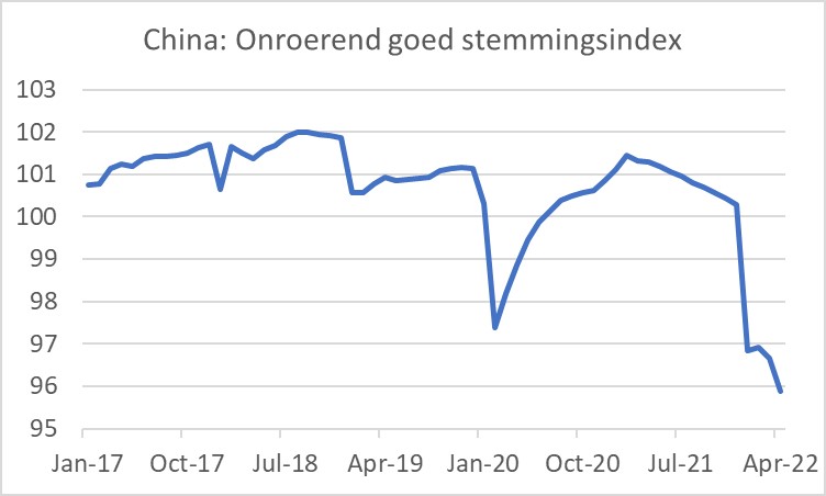 De Chinese economie koelde ook zonder de lockdownmaatregelen van de laatste maanden reeds af. Het aantal in aanbouw genomen woningen, lang een belangrijke groeimotor, daalt al tijden. Al vanaf augustus vorig jaar is het aantal lager dan een jaar eerder. In april stond die teller op -28,4%. De verkopen lagen in april 32,2% lager dan in april 2021. De stemmingsindicator voor de onroerendgoedmarkt heeft de laatste maanden ook een forse duikeling gemaakt. Het is dan ook niet zo verrassend dat de Chinese centrale bank deze week de referentierente voor hypotheken voor de tweede keer dit jaar verlaagde.