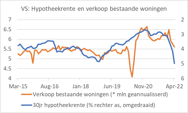 Niet verrassend is het dus dat de NAHB-index, die het sentiment meet onder huizenbouwers, in mei voor de vijfde achtereenvolgende maand daalde: 69 tegen 77 in april en 84 in december 2021. De Chief Economist van deze organisatie zei: "De huizenmarkt staat voor steeds grotere uitdagingen. De kosten van bouwmaterialen zijn met 19% gestegen ten opzichte van een jaar geleden; in minder dan drie maanden zijn de hypotheekrentes gestegen tot het hoogste punt in twaalf jaar en op basis van de huidige betaalbaarheid is minder dan 50% van de verkopen van nieuwe en bestaande huizen betaalbaar voor een doorsnee gezin."
