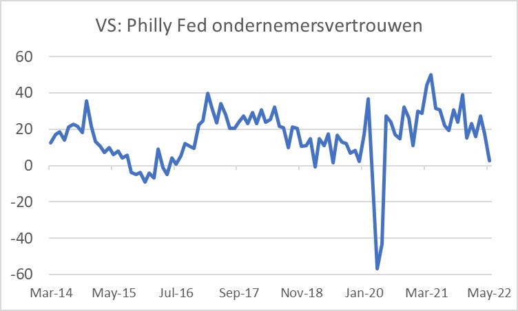 De eerste indicaties van hoe het producentenvertrouwen zich momenteel ontwikkelt, zijn niet positief. Zowel de Empire State index (New York Fed) als de Philly Fed index daalde in mei. De Philly Fed index kwam uit op 2,6, het laagste niveau sinds mei 2020, tegen 17,6 in april.