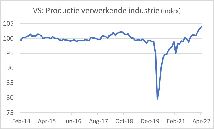 Aan de positieve kant viel er deze week in de VS ook wel iets op te tekenen. Zo groeiden de detailhandelsverkopen in april stevig verder, al wordt het beeld vertekend door de opgelopen inflatie. Ook de productie in de verwerkende industrie stijgt gestaag door. Ik vind de volgende grafiek best intrigerend. In de zes jaar voor de pandemie groeide de productie in de verwerkende industrie in de VS per saldo nauwelijks en slingerde de index de hele periode rond de 100. Vanzelfsprekend daalde de productie fors toen de pandemie uitbrak en de economie op slot ging. Herstel volgde na april 2020. Vervolgens duurde het ruim een jaar voordat het oude productieniveau weer was bereikt, maar inmiddels lijkt de stijging van de productie niet meer te stuiten. Op de een of andere manier lijkt er veel meer dynamiek in de Amerikaanse industrie te zitten dan voor de pandemie.