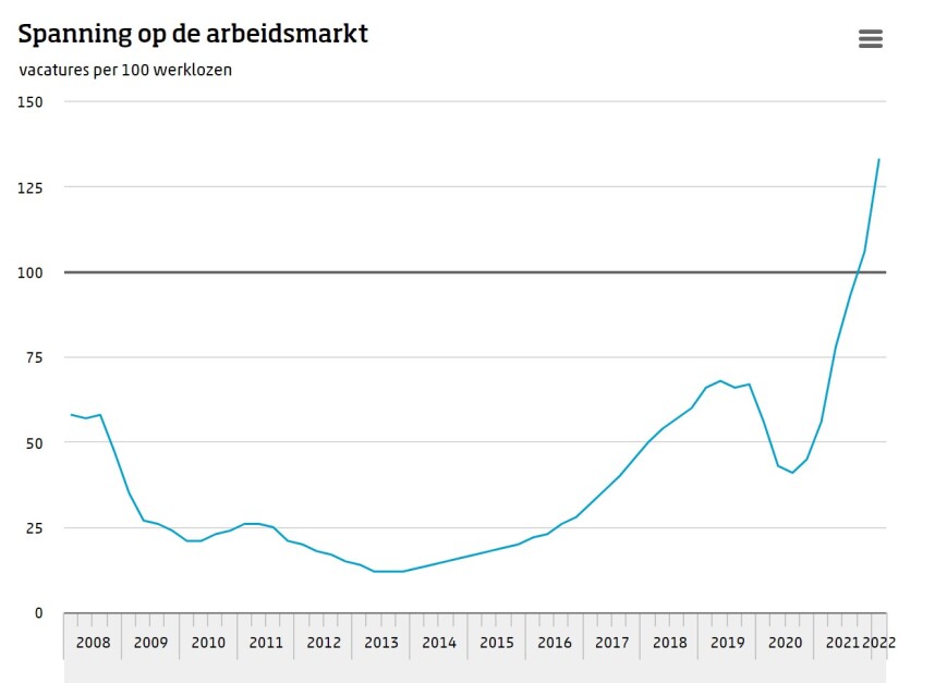 De spanning op de arbeidsmarkt is ongekend. Het aantal vacatures per 100 werklozen steeg van 106 in het vierde kwartaal vorig jaar tot 133 in het eerste kwartaal (in de VS overigens 190). Er wordt wel gezegd dat bedrijven vacatures plaatsen die ze uiteindelijk niet willen vullen. Ze zouden dat doen om een gevoel te krijgen of te behouden van de arbeidsmarkt.