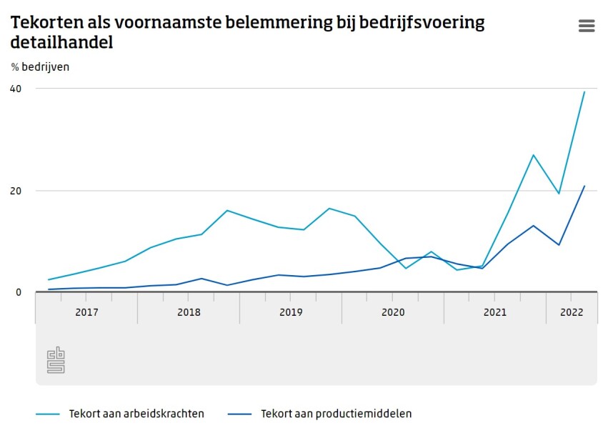 Ondernemers in de detailhandel schreeuwen om het hardst vanwege gebrek aan personeel. Volgens het CBS zegt bijna 40% van detaillisten dat ze in hun bedrijfsvoering worden belemmerd door personeelstekorten. Dat is verbluffend. Als we niet uitkijken gaan personeelstekorten een muur vormen voor verdere economische groei. Voor de pandemie was ook al sprake van arbeidsschaarste. Toch zei toen 'slechts' circa 10% van de ondervraagde ondernemers dat personeelstekorten de bedrijfsvoering belemmerde.