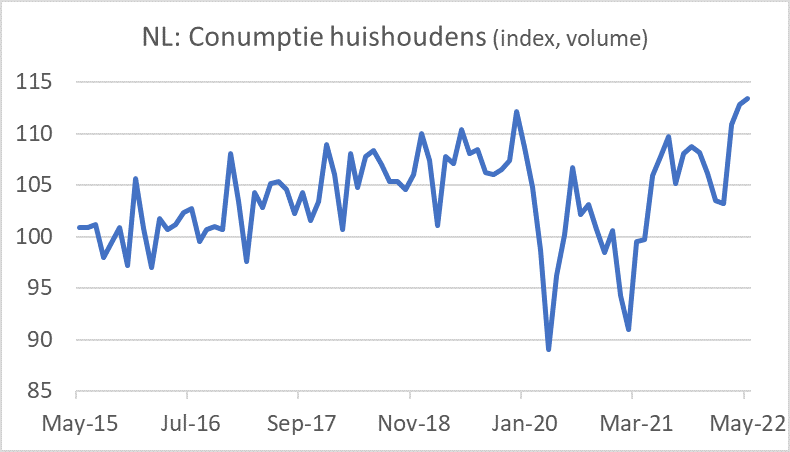 Het volume van de consumptieve uitgaven in ons land lag in mei 7,3% hoger dan een jaar eerder. Aan diensten werd zo'n 19% meer uitgegeven dan in mei 2021, aan goederen zo'n 5% minder. Die jaar-op-jaar cijfers worden nogal sterk beïnvloed door basiseffecten die weer door de diverse lockdowns zijn bepaald. Daarom heb ik in de eerste grafiek de index van de consumptie weer gegeven. In mei 2022 lag het volume van de totale consumptie 4,4% hoger dan in januari 2020, juist voor de pandemie. De koopkracht is sindsdien achteruitgegaan, dus is het duidelijk dat gezinnen momenteel in hun spaarpotten duiken. Uiteraard moeten we er rekening mee houden dat niet iedereen een spaarpot heeft aan weten te leggen, dus voor een deel van de huishoudens is het momenteel erg moeilijk.