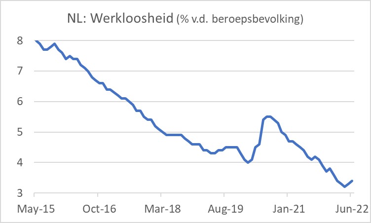 Ondertussen verzwakt de Nederlandse conjunctuur al. Het werkloosheidspercentage is in juni voor de tweede maand op rij iets gestegen: 3,4% tegen 3,3% in mei. Daarmee blijft de werkloosheid uiteraard wel historisch laag. Je zou zelfs kunnen beweren dat een verdere ontspanning van de arbeidsmarkt welkom zou zijn vanwege de bestaande arbeidstekorten.