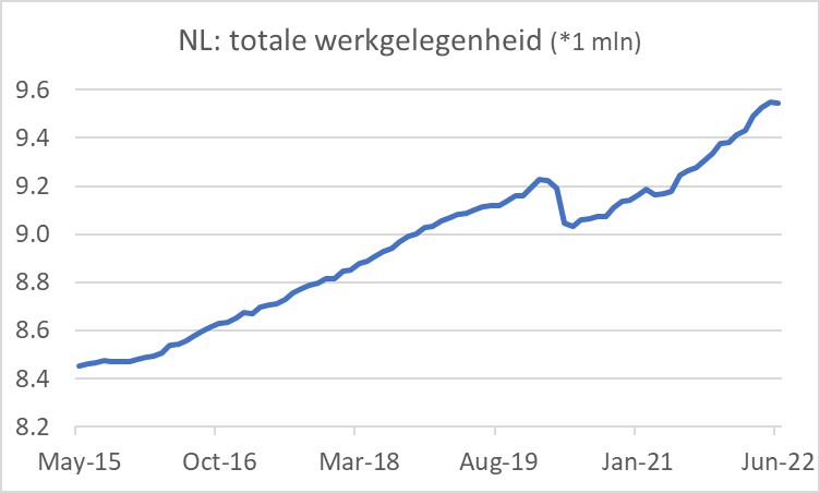 De totale werkgelegenheid in ons land bedraagt momenteel iets meer dan 9,5 miljoen banen. Een visuele inspectie van de bovenstaande grafiek suggereert dat er niet of nauwelijks sprake is van permanent banenverlies door de pandemie.