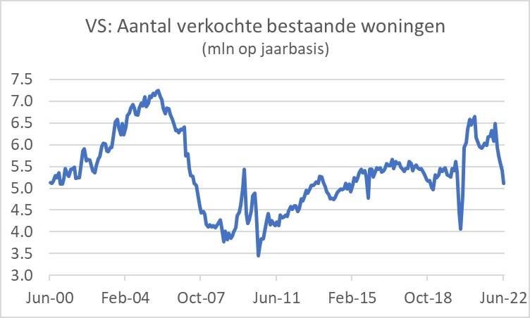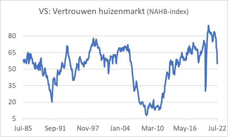 Recente cijfers impliceren dat de conjunctuur in de VS, of tenminste delen van de economie, momenteel in hoog tempo afkoelen. De huizenmarkt is een belangrijke drijver van de Amerikaanse conjunctuur. Ik heb er al diverse keren op gewezen dat de hypotheekrente in de eerste maanden van dit jaar heel fors is gestegen. Dat heeft zijn weerslag op de huizenmarkt. De National Association of Home Builders publiceert maandelijks de resultaten van een enquête onder aannemers en makelaars. De NAHB-index reflecteert het algehele vertrouwen in de huizenmarkt. In juli is die index uitgekomen op 55 tegen 67 in juni. De grafiek laat duidelijk zien dat de laatste maanden sprake is van een snel verlies van vertrouwen, maar ook dat het huidige niveau bepaald niet laag is in historisch perspectief. Het gemiddelde van de index vanaf 1985 is 52.