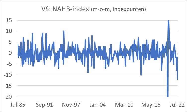 Lichtelijk 'nerdy' als ik ben, heb ik ook een plaatje gemaakt van de verandering van de index per maand. Dat plaatje laat zien dat de daling van de index in juli (-12 punten) historisch heel uitzonderlijk is. Alleen in april 2020 daalde deze index in één maand tijd meer (-41 punten). Waarom de index in juli zo sterk is gedaald, is eigenlijk een beetje een raadsel want de hypotheekrente is in juli juist gestabiliseerd. Misschien is de daling van de NAHB-index nog een verlate reactie op de eerdere stijging van de rente, of hangt het samen met de voortdurend hoge inflatie en de verdere verzwakking van het consumentenvertrouwen.