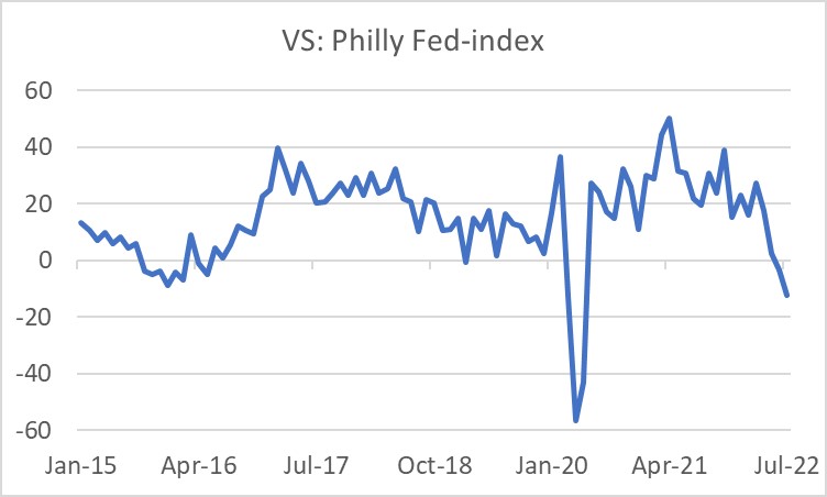 En dat de economie over een breder front aan vaart verliest, blijkt onder andere uit de wekelijkse cijfers over aanvragen voor werkloosheidsuitkeringen. In de week van 16 juli was dat aantal 251.000, weer iets hoger dan de 245.000 van de week ervoor. Ook de Philly Fed index, die het vertrouwen meet van ondernemers in het district van de Federal Reserve van Philadelphia, bevestigt de zwakkere conjunctuur. Deze index daalde van -3,3 in juni tot -12,3 in juli. Het langetermijngemiddelde van deze index is +8.