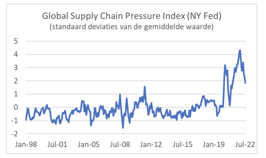 Maar misschien heeft Hans gelijk en is er voldoende groeimomentum om uit een recessie te blijven. Daar komt bij dat enkele problemen aan de productiekant van de economie lijken te verminderen. De logistieke verstoringen en de zeer hoge vrachtprijzen remmen de productiekant van de economie nog, maar de situatie verbetert zich en dat biedt ruimte voor groei. De Federal Reserve van New York heeft een indicator ontwikkeld, waarmee ze de druk op productieketens proberen te meten: de Supply Chain Pressure Index. Die laat de laatste maanden enige ontspanning zien.