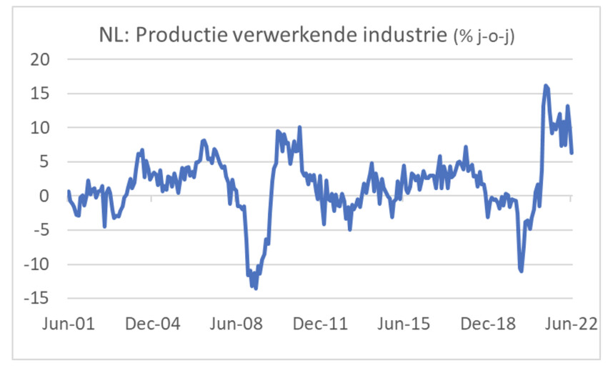 De verwerkende industrie in ons land heeft zich de laatste tijd zeer positief onderscheiden van de meeste andere landen in Europa, maar de productiegroei zwakt nu toch ook bij ons wat af. In juni lag het productieniveau nog 6,2% hoger dan een jaar eerder, tegen 9,9% en 13,8% in respectievelijk mei en april.