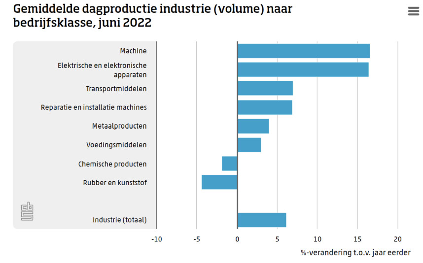 De 'Machinebouw' en de 'Elektrische en Elektronische Apparaten' blijven de sterkst groeiende sectoren. Toch zit de klad er de laatste maanden wat in. In vijf van de eerste zes maanden van dit jaar is de productie iets gedaald ten opzichte van de maand ervoor. Hier is voorzichtigheid wel geboden, want die maandelijkse cijfers springen nogal op en neer, maar toch. Wel positief is dat het wat beter lijkt te gaan met de transportmiddelenindustrie. Daar trekt de productie aan. Nadat in de eerste maanden van het jaar het productievolume nog circa 10% lager had gelegen dan een jaar eerder, werd in juni een +7,0% geboekt. Duidt dat er misschien op dat de chip-problemen in de sector minder worden?