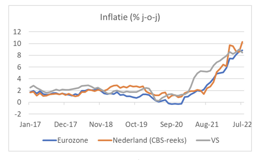 De Amerikaanse inflatie is in juli gedaald: 8,5% tegen 9,1% in juni. Daarmee ligt de inflatie in de VS voor het eerst sinds jaren lager dan die in de eurozone. In ons eigen land steeg de inflatie in juli juist verder en ligt die nu zowel op de Europese als op de nationale maatstaf ruim hoger dan de Amerikaanse.