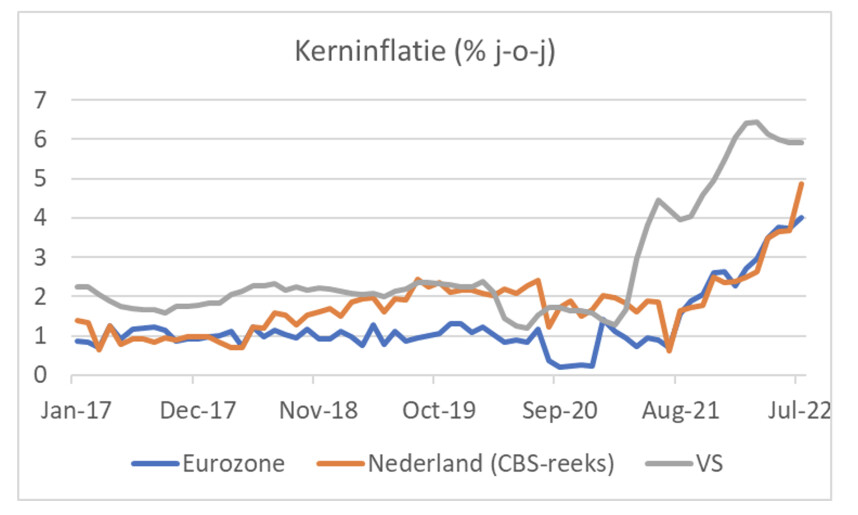 De ECB heeft pas onlangs de officiële rente verhoogd, terwijl de Fed daar in maart al mee is begonnen en inmiddels 2,25%-punt renteverhoging heeft doorgevoerd. ECB-baas Lagarde voert al tijden ter rechtvaardiging voor de afwijkende benadering aan dat de inflatie bij ons heel anders is dan die in de VS. Sommige bankeconomen roepen haar dat na. Bij ons is energie de grote boosdoener, terwijl de Amerikaanse economie, in tegenstelling tot de onze, oververhit zou zijn. Tot op zekere hoogte klopt dat ook wel. De kerninflatie, dus exclusief voedsel en energie, ligt in de VS duidelijk hoger dan bij ons. Al zijn we inmiddels aan een inhaalbeweging begonnen en vlakt de kerninflatie in de VS al maanden af, zoals de volgende grafiek duidelijk maakt.