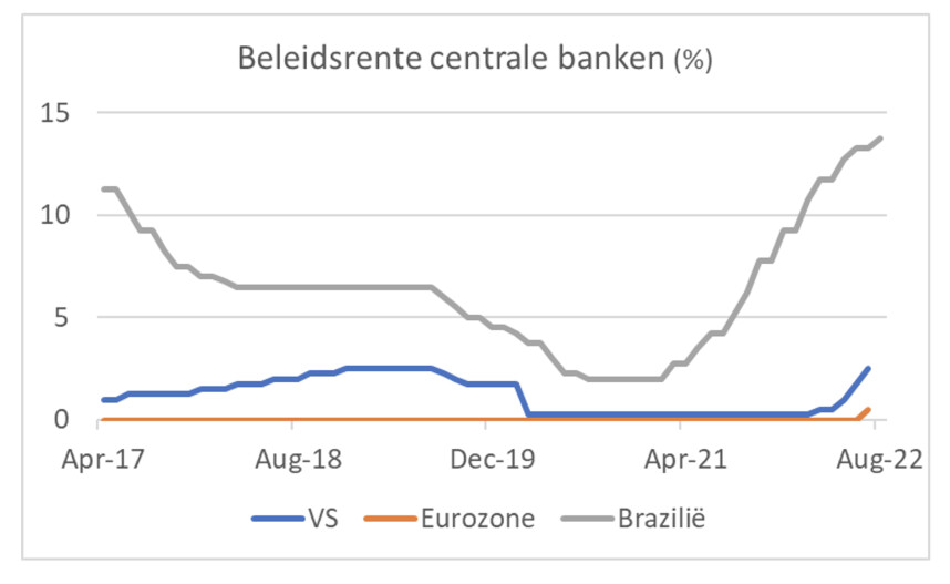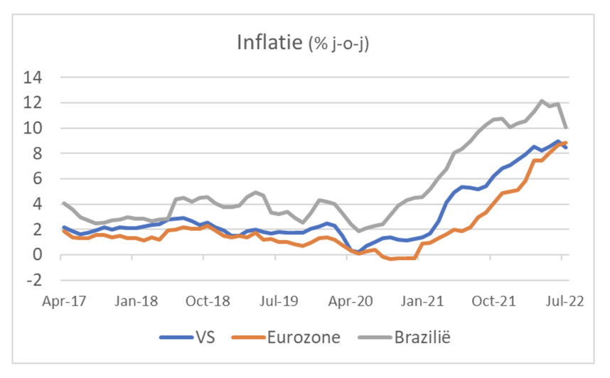 Er is in mijn optiek een ongekend interessant experiment gaande in het monetaire beleid. Overal is de inflatie een enorm probleem en tot op zekere hoogte is de situatie in de diverse landen goed vergelijkbaar, al zijn er van land tot land ook verschillen. De verschillen in het beleid zijn echter wel opvallend groot en de vraag is of dat is gerechtvaardigd. Beschouw bijvoorbeeld de situatie in Brazilië, de VS en de eurozone. De inflatie in Brazilië is hoger dan in de VS of bij ons. Dat is al heel lang zo, maar de stijging van de inflatie loopt redelijk parallel. De centrale bank van Brazilië heeft inmiddels al twaalf keer de rente verhoogd en is daar in maart 2021 al mee begonnen. We gaan zien hoe dit afloopt. Overigens merk ik op dat de Europese gasprijs (TTF) weer boven €200 MWh noteert. Dat is niet best voor ons.