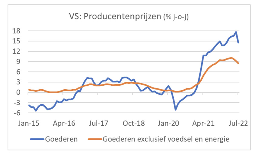 Wat er met de inflatie in de VS gebeurt, is van groot belang voor de ontwikkelingen op de financiële markten. Die inflatie heeft immers grote invloed op de Amerikaanse rente en die is voor andere markten een anker. Ik zie iets positiefs en ook iets minder positiefs. Het positieve is dat de inflatie in de VS bij of misschien wel net voorbij het hoogtepunt is. Natuurlijk moet je de nodige slagen om de arm houden. Maar één van de voorgaande grafieken liet zien dat de kerninflatie al maanden stabiliseert. Bij de producentenprijzen zien we ook enige ontspanning, vooral waar het goederen betreft zoals de volgende grafiek laat zien. Producentenprijzen lopen soms iets voor op consumentenprijzen.