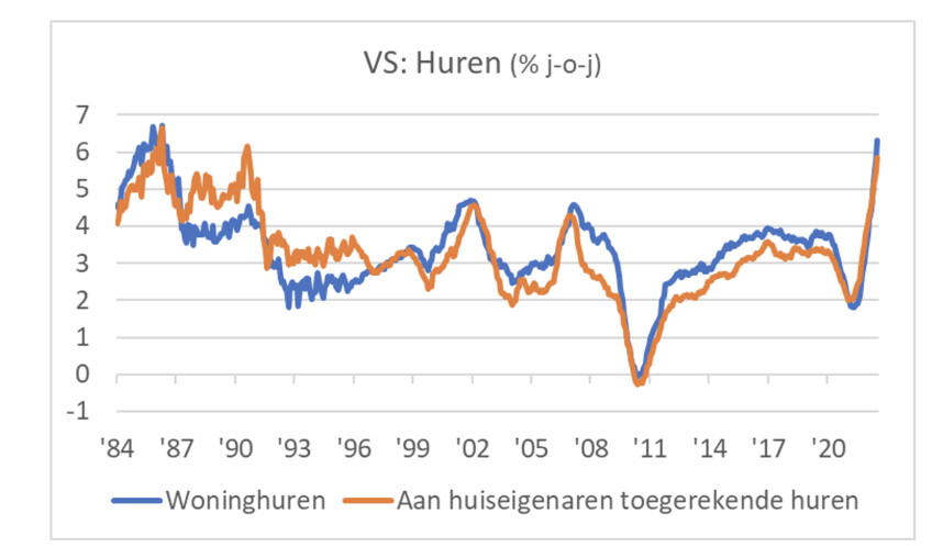 Ik denk daarom dat de Amerikaanse inflatie de komende tijd nog wat verder daalt. De vraag is wel, tot hoe ver en hoe snel? Hier moet ik iets minder positiefs opmerken. Ik heb er al vaak eerder over geschreven. Huren (de werkelijke woninghuren en de aan huiseigenaren toegerekende huren) maken bijna een derde uit van de Amerikaanse inflatiemand (CPI). Die huren volgen met enige vertraging de huizenprijzen. Inmiddels stijgen huren met zo'n 6%, zoals de laatste grafiek laat zien. Dat kan nog best eens wat verder oplopen. Als huren in een dergelijk tempo stijgen, wordt het heel moeilijk om binnen afzienbare tijd inflatiecijfers dicht bij de 2% doelstelling van de Fed te krijgen.