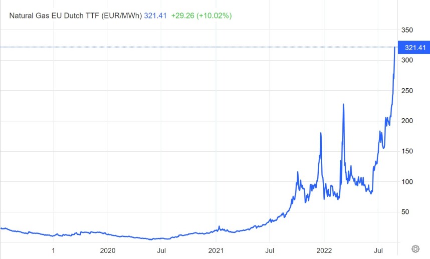 Terwijl alle economen reikhalzend uitzien naar de woorden die Fed-baas Jerome Powell gaat uitspreken op de Jackson Hole-conferentie stijgt de Europese gasprijs gestaag verder. Het eerste plaatje is een screenshot van donderdag 25 augustus circa 18.30 uur. €321 per MWh! In een maand tijd is de al hoge gasprijs met meer dan 50% gestegen. Voor de pandemie was €15 een normale prijs en even daalde de gasprijs zelfs tot €5 in de eerste maanden na het uitbreken van de pandemie. De prijs is nu dus meer dan 21 keer zo hoog als voor de pandemie (op vrijdagochtend is de prijs tot iets onder €300 MWh gezakt).
