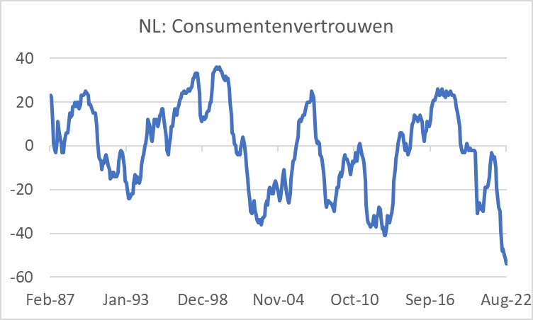 Het Nederlandse consumentenvertrouwen is in augustus opnieuw naar een record gedaald: -54, tegen -51 in juli. Het was de vierde keer dit jaar dat een nieuw diepterecord werd gevestigd. En gelet op het bovenstaande zit het er dik in dat er meer records gaan volgen.